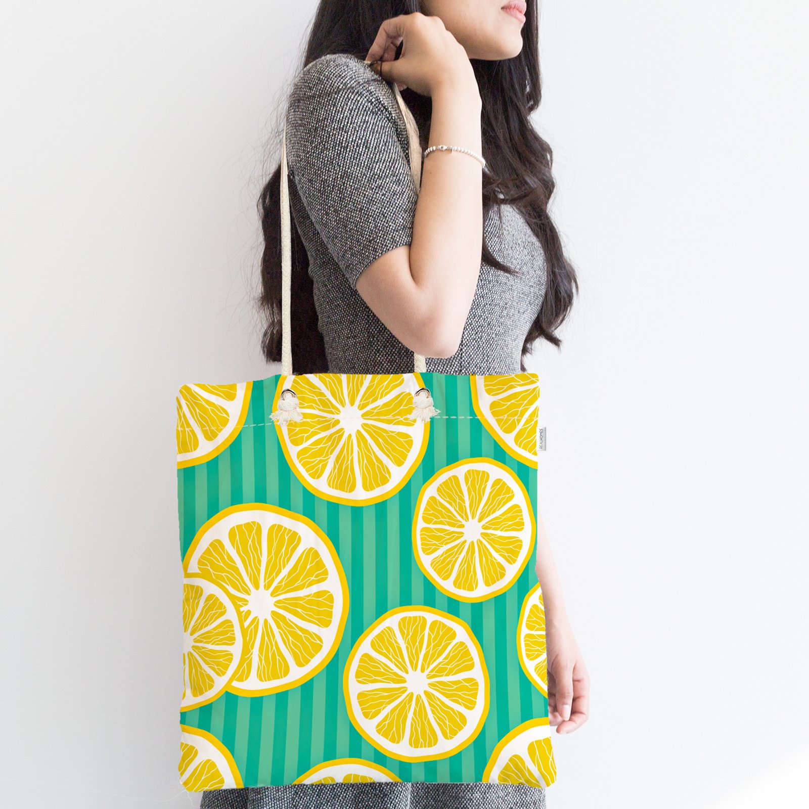 Yeşil Zeminde Limonlar Özel Tasarımlı Fermuarlı Bez Çanta