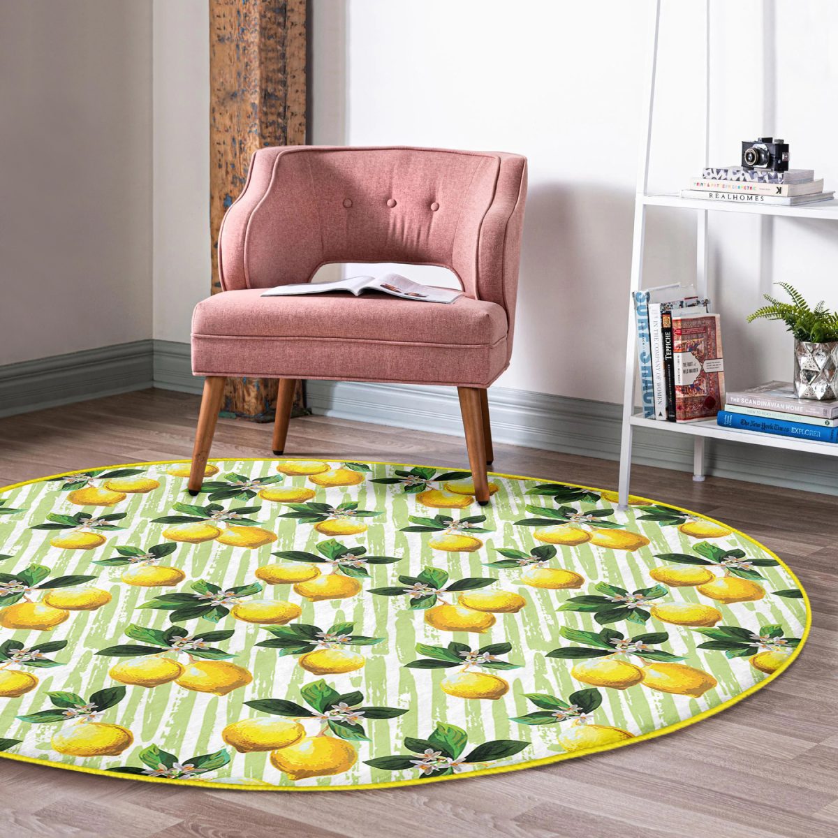 Yeşil Zeminli 3 Boyutlu Limon Desenli Dijital Baskılı Gold Outdoor Yıkanabilir Kaymaz Tabanlı Yuvarlak Halı
