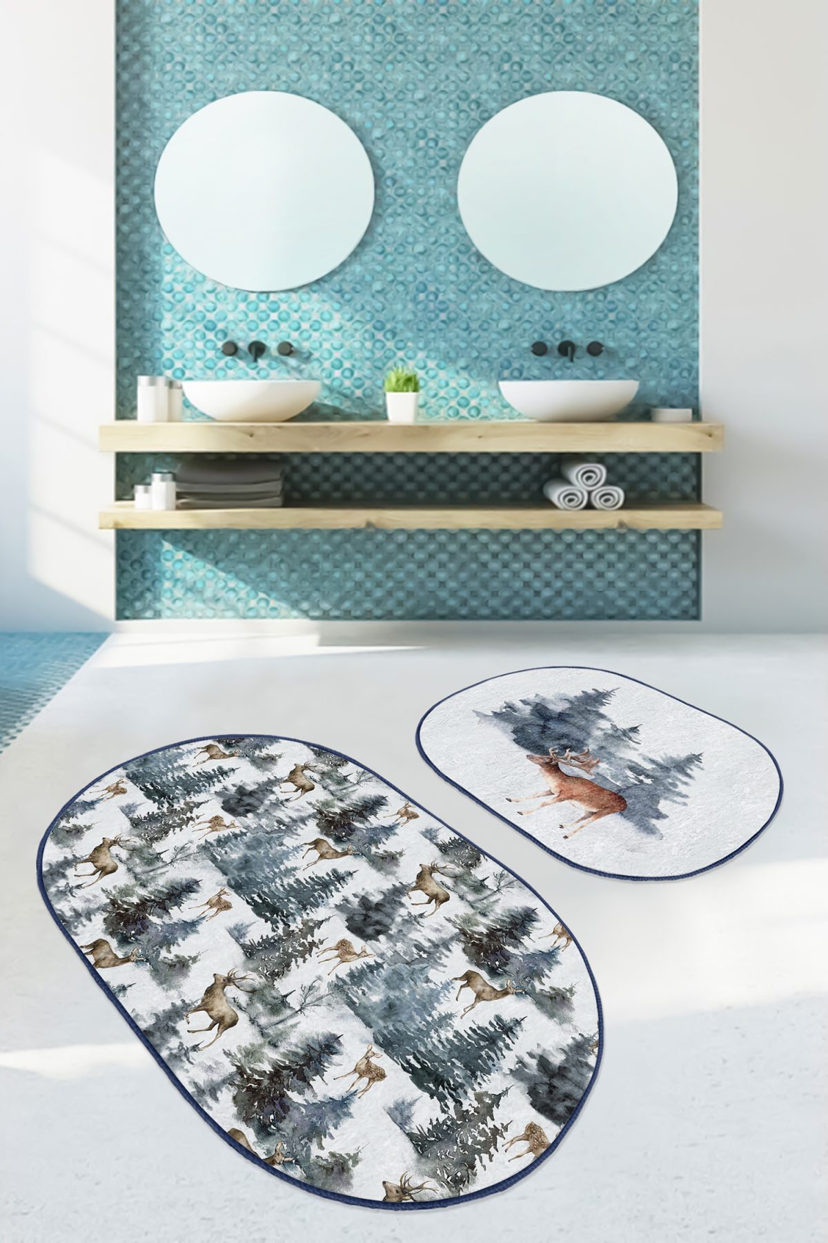 Yılbaşı Temalı Çam Ağaçları Geyik Tasarımlı 2'li Oval Kaymaz Tabanlı Banyo & Mutfak Paspas Takımı Realhomes