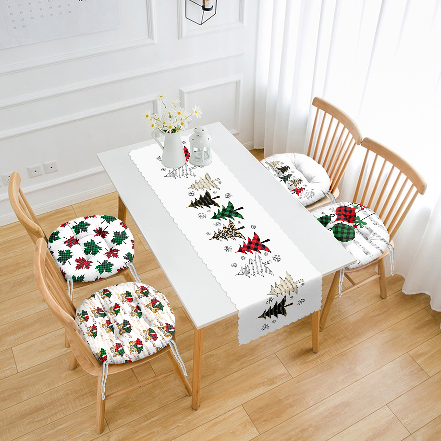Yılbaşı Temalı Ekose Çam Ağaç Tasarımlı 4 Yuvarlak Pofuduk Sandalye Minderi ve 1 Runner Seti Realhomes