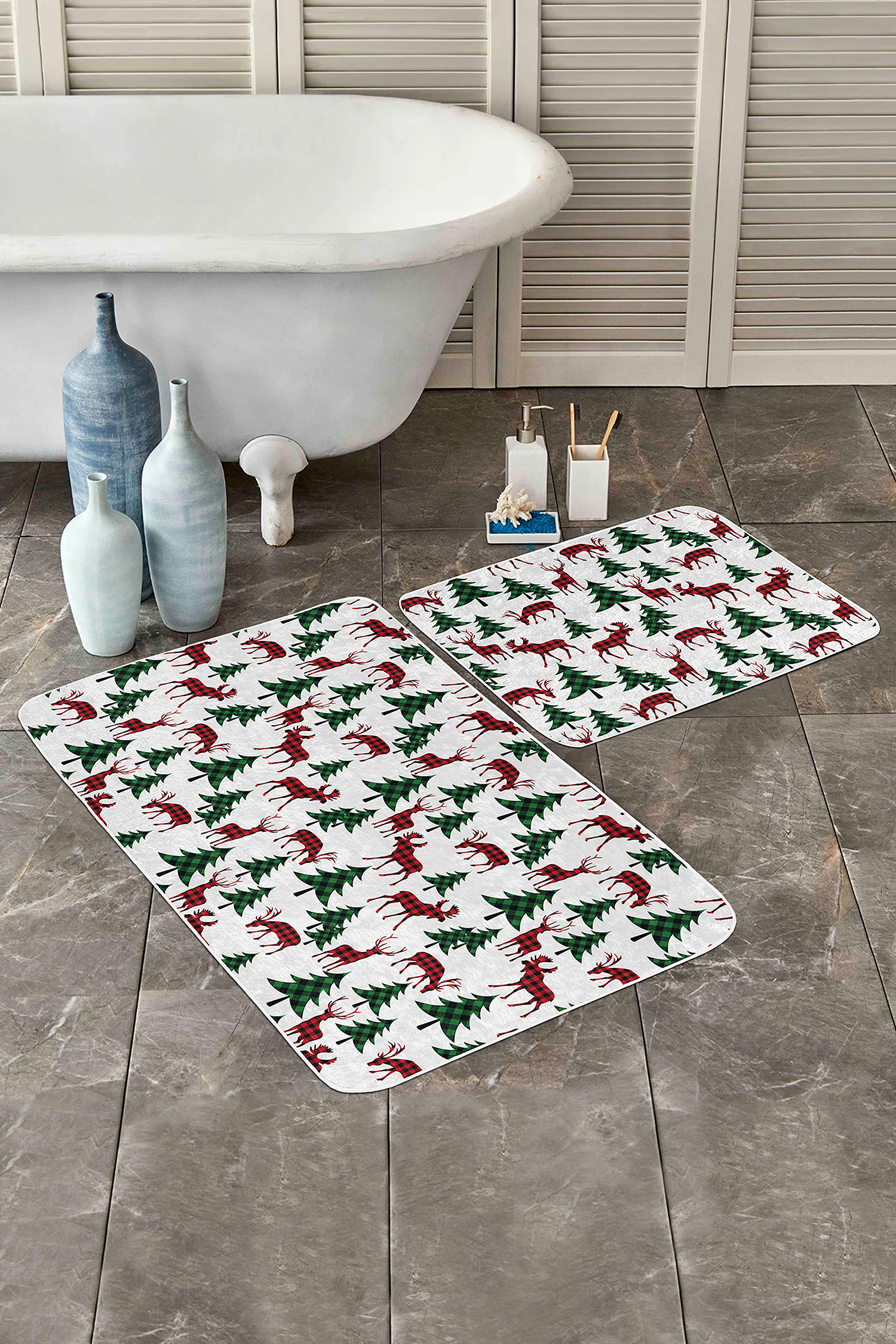 Yılbaşı Temalı Ekose Çam Ağacı Geyik Motifli 2’li Kaymaz Tabanlı Banyo & Mutfak Paspas Takımı