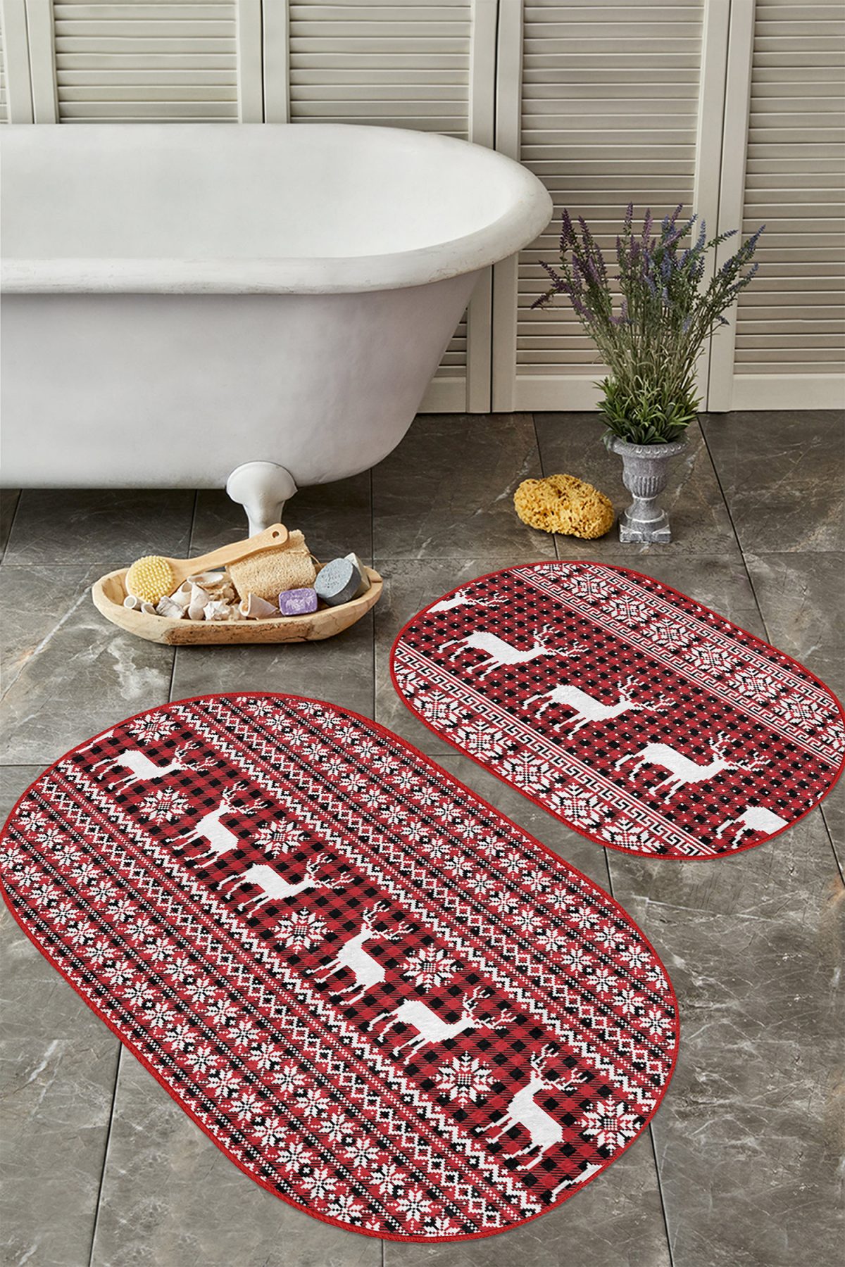 Yılbaşı Temalı Kanaviçe Motifli Geyik Özel Tasarım 2'li Oval Kaymaz Tabanlı Banyo & Mutfak Paspas Takımı Realhomes