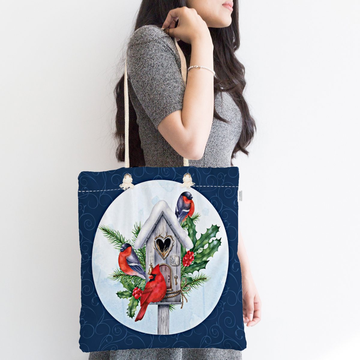 Yılbaşı Temalı Kuş Tasarımlı Dijital Baskılı Fermuarlı Kumaş Omuz Çantası