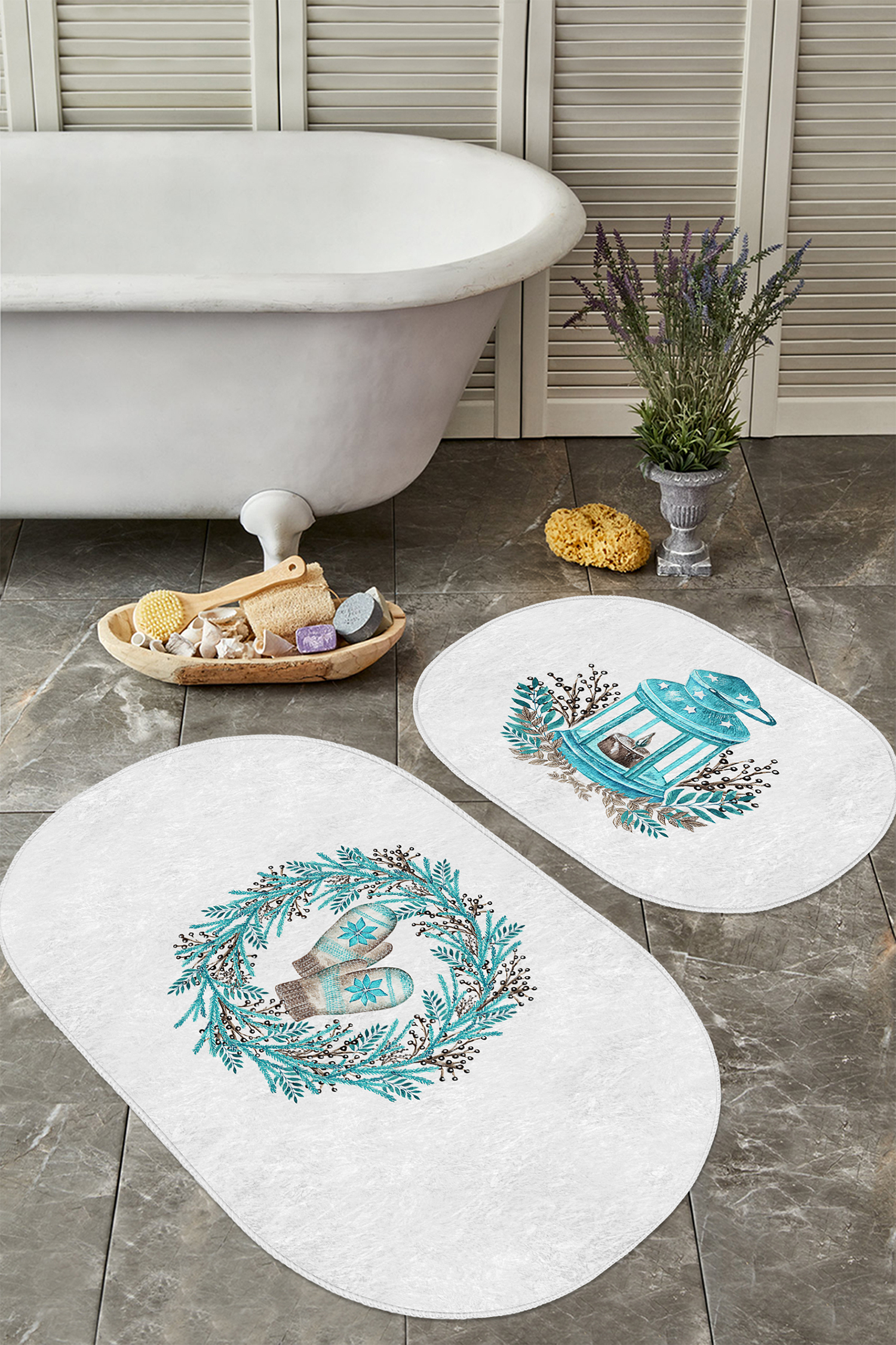 Yılbaşı Temalı Mavi Çelekli Dijital Baskılı 2’li Oval Kaymaz Tabanlı Banyo & Mutfak Paspas Takımı