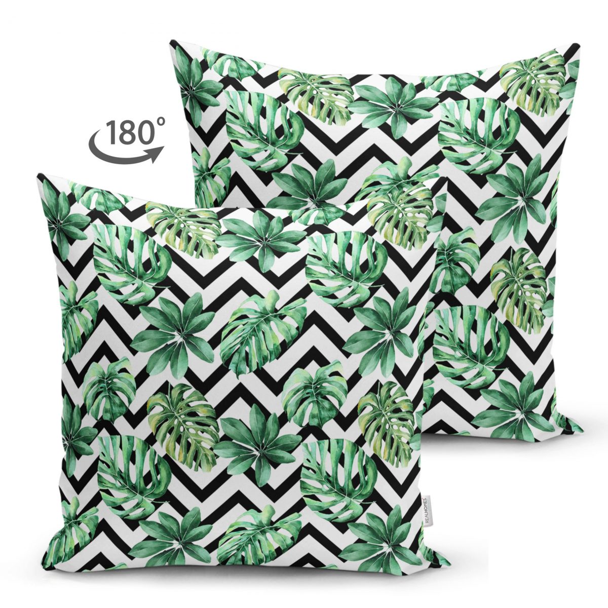 Zigzag Siyah Beyaz Şerit Temalı Yaprak Çizimi Çift Taraflı Süet Kırlent Kılıfı