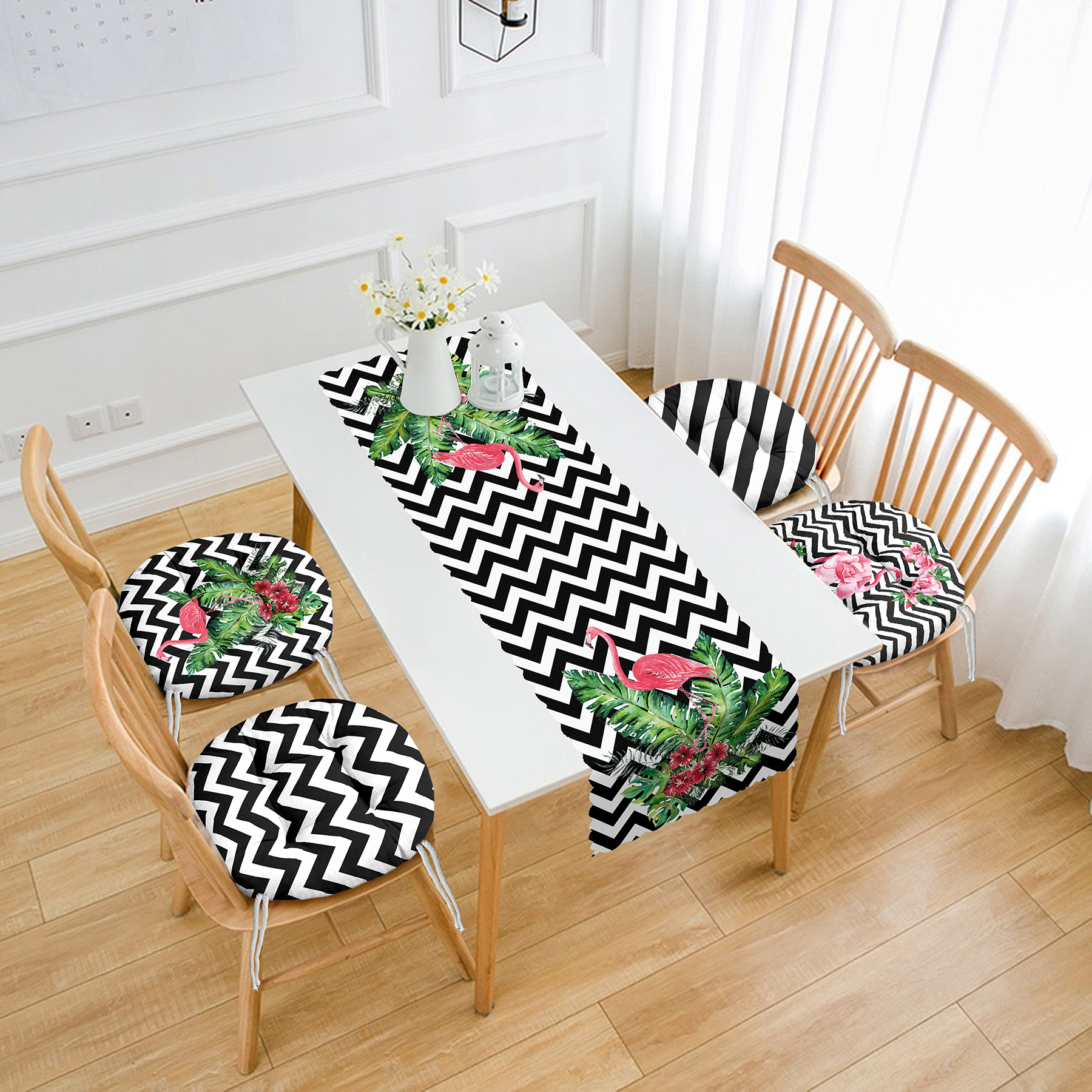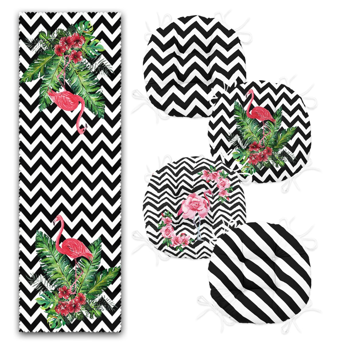 Zizag Zeminli Flamingo Tasarımlı 4 Yuvarlak Pofuduk Sandalye Minderi ve 1 Runner Seti