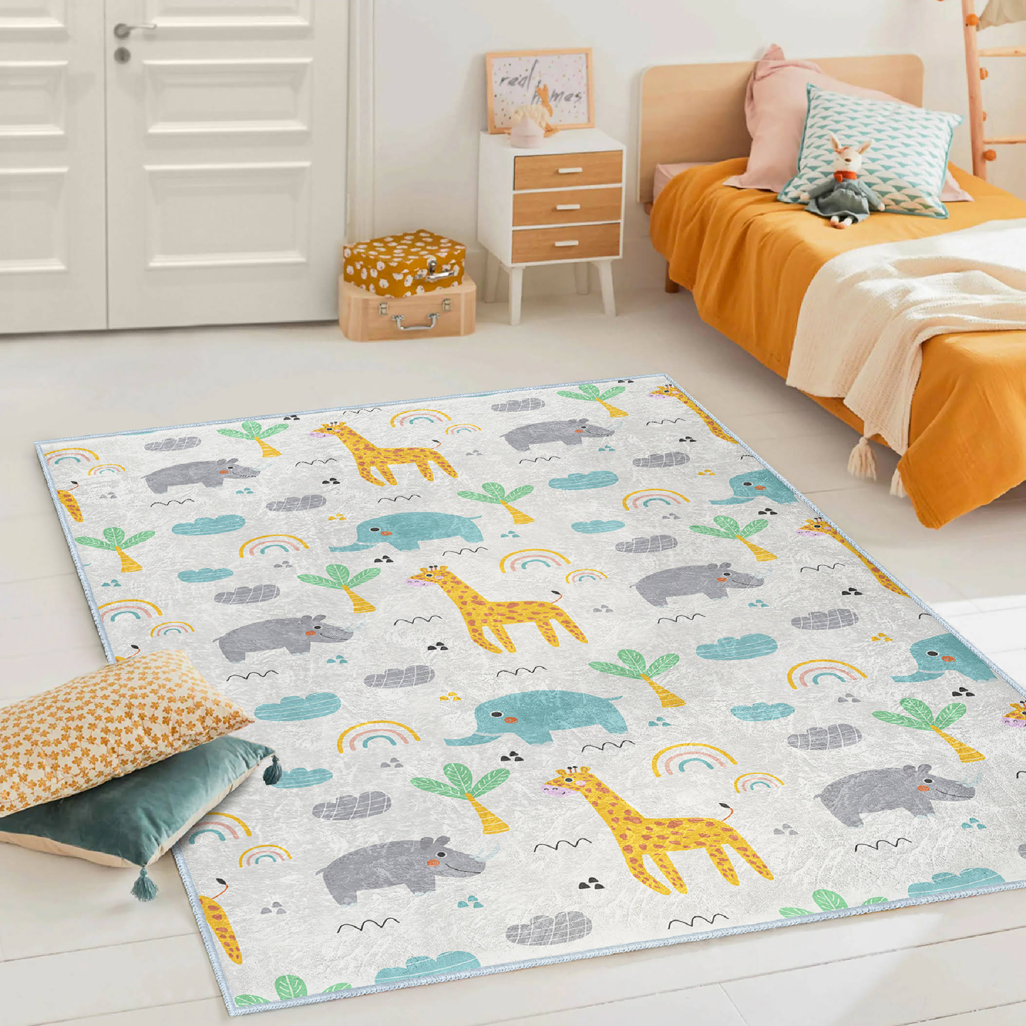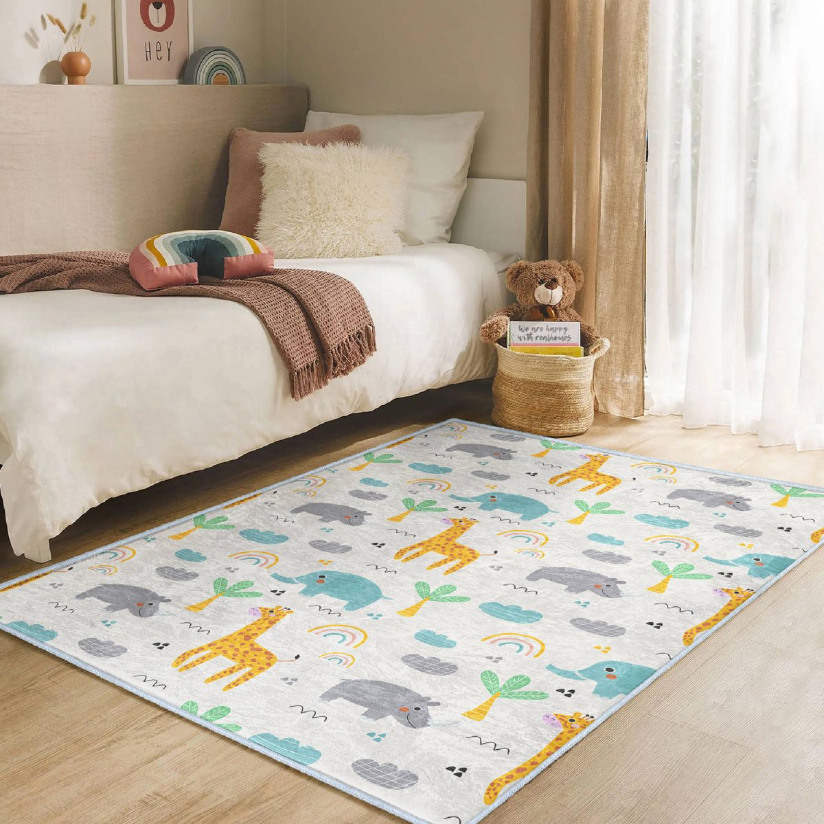 Zürafa Fil Temalı Çocuk & Genç Odası Makinede Yıkanabilir Kaymaz Tabanlı Pamuk Tabanlı Dikdörtgen Özel Ölçü Çocuk Odası Halısı