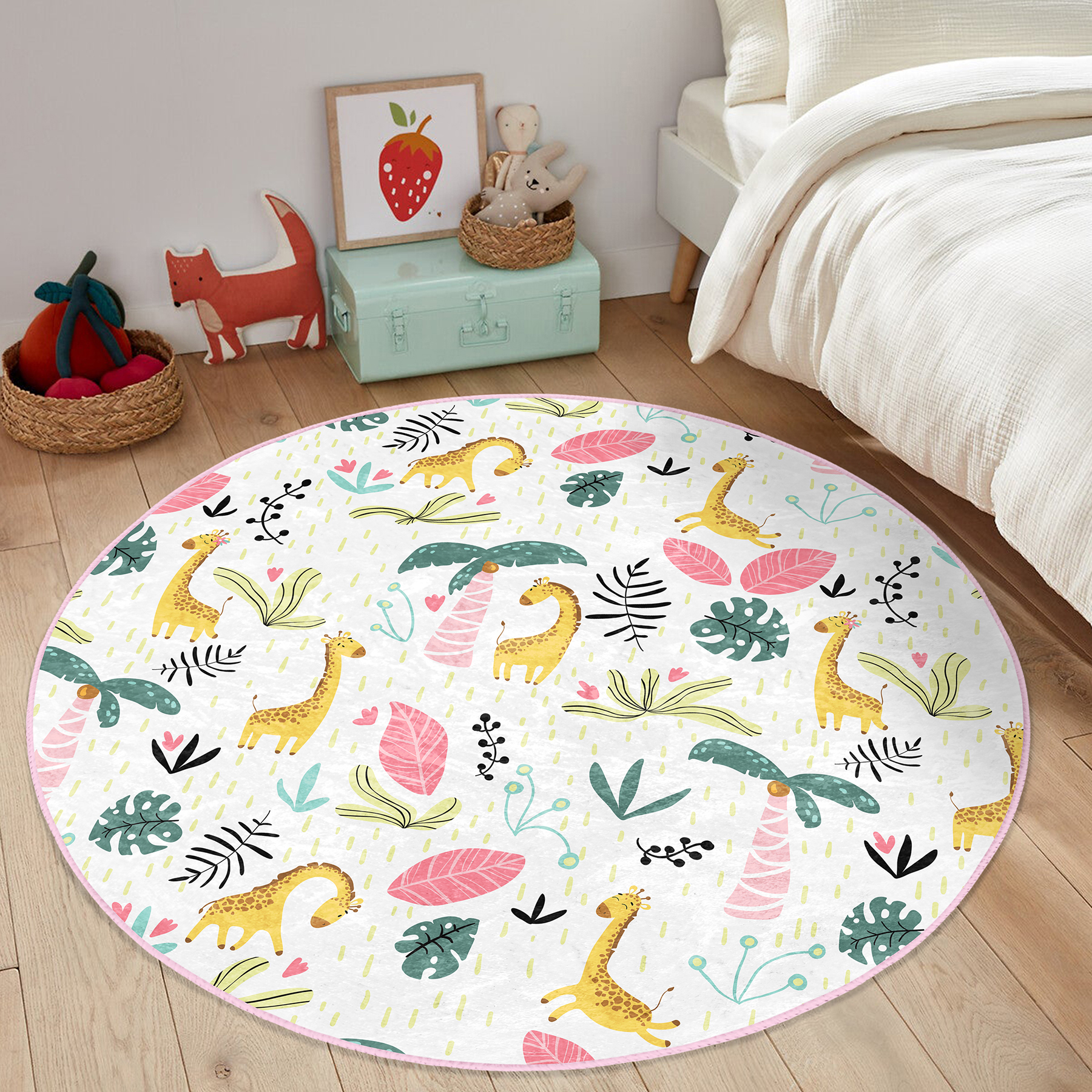 Zürafa Ve Orman Temalı Çocuk & Genç Odası Makinede Yıkanabilir Kaymaz Tabanlı Yuvarlak Çocuk Halısı